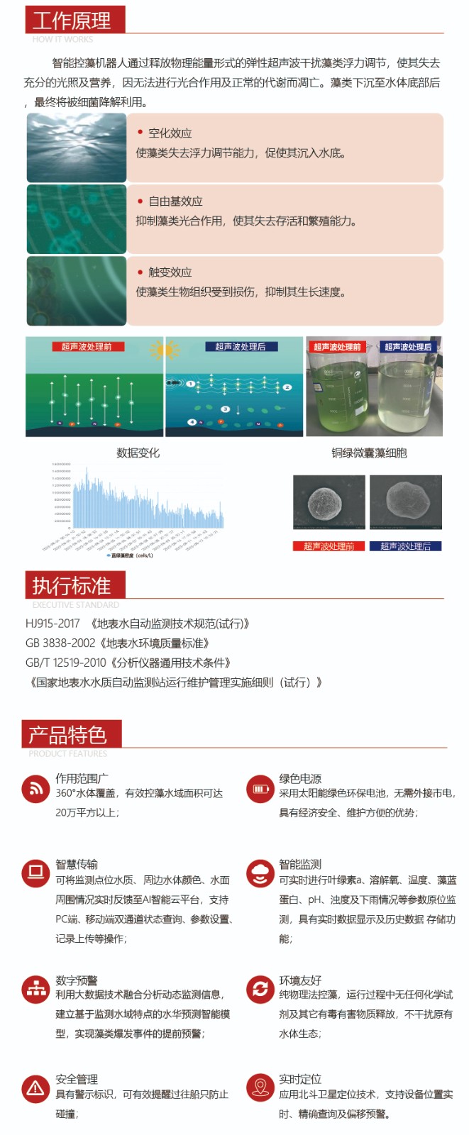 UCA1000智能控藻机器人由浙江BG视讯平台仪器仪表股份有限公司协同中国船舶集团第七一 五研究所、浙江省生态环境科学设计研究院、浙江大学长三角智慧绿洲创新中心共同研制。 UCA1000智能控藻机器人作为浙江省“尖兵”、“领雁”重点研发成果,采用定时监 测的超声波抑藻除藻技术,融合物联网传感器、AI人工智能云算法、北斗卫星定位通讯等 先进技术,依托智慧信息管理平台,能够在不影响原有水体生态系统及周边生态环境的前 提下,实现全天候定点水质监测、水质数据分析预警及藻类爆发早期生长抑制等功能。可 有效保持水体生态平衡,具有立体监测、响应速度快、监测范围广等优势。 |