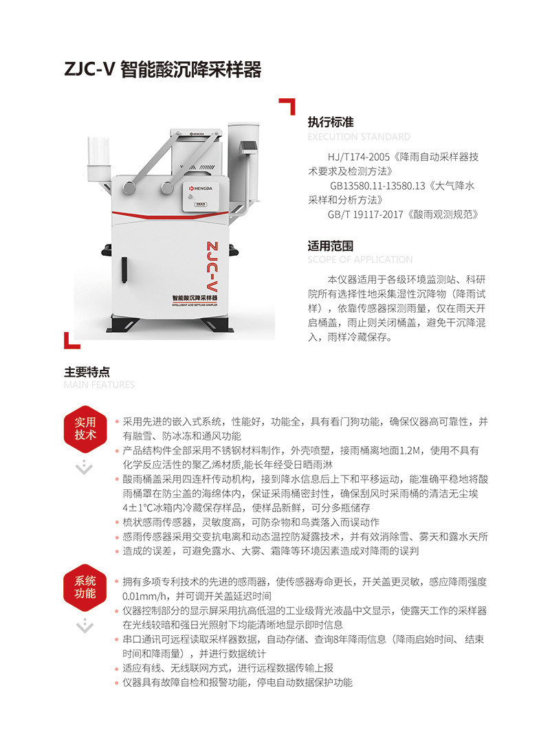 本仪器适用于各级环境监测站、科研院所有选择性地采集湿性沉降物(降雨试样),依靠传感器探测雨量,仅在雨天开启桶盖,雨止则关闭桶盖,避免干沉降混入,雨样冷藏保存。